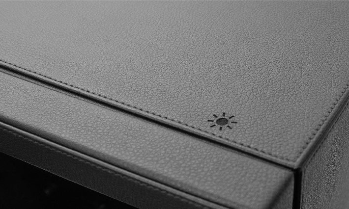 Dieses Gerät besticht durch sein Ledergehäuse und das schwarze Samtfutter. Der Boxy BLDC ist mit einer integrierten LED-Beleuchtung ausgestattet, die sich durch sanftes Berühren des Lichtsymbols am Gehäuse ein- und ausschalten lässt.